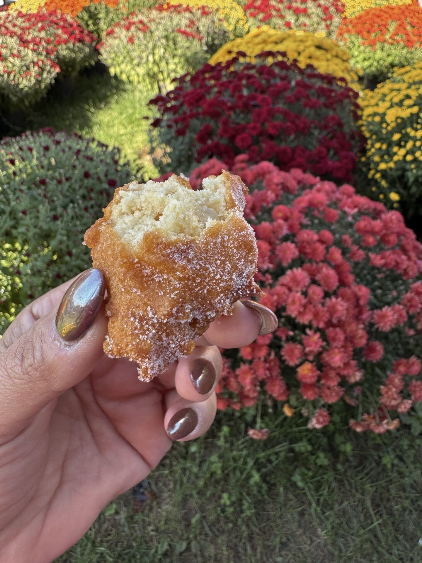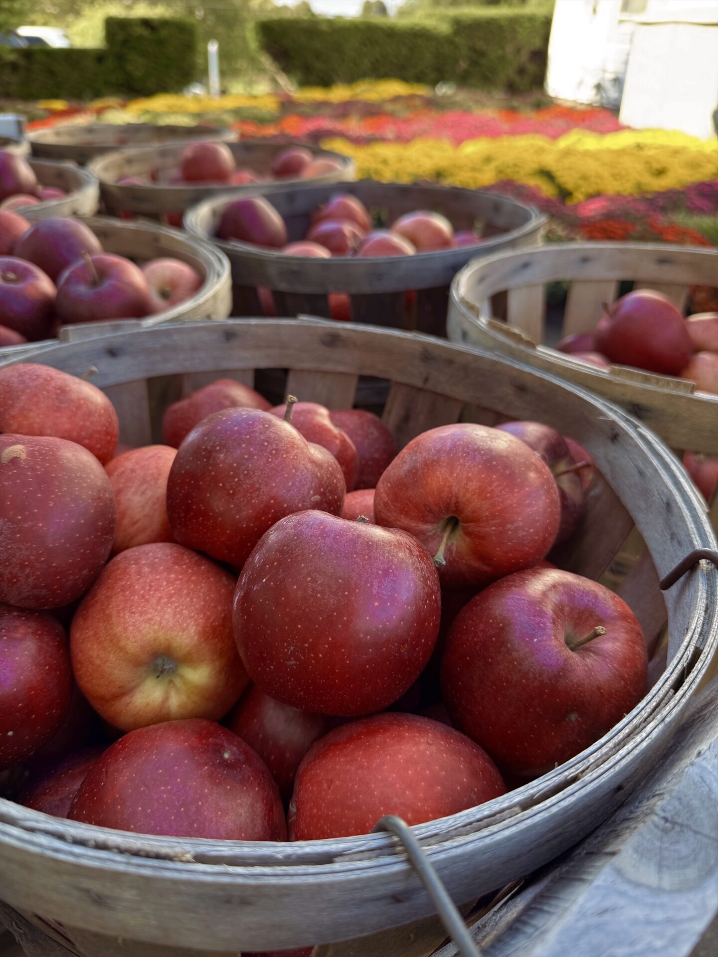 We wandered through rows of apple trees, taste-testing as we went (because of course that’s part of the fun). We filled our bag until it was overflowing, 5 lbs to be exact! There’s something so grounding about the simplicity of it, no rush, no noise, just family, fresh air, and a few sticky fingers. And of course, no trip to the orchard is complete without a stop at the farm stand for warm sweet apple fritters, fresh-pressed apple cider, and a few jars of apple butter “for later” and another huge mum for the front entrance of our house.